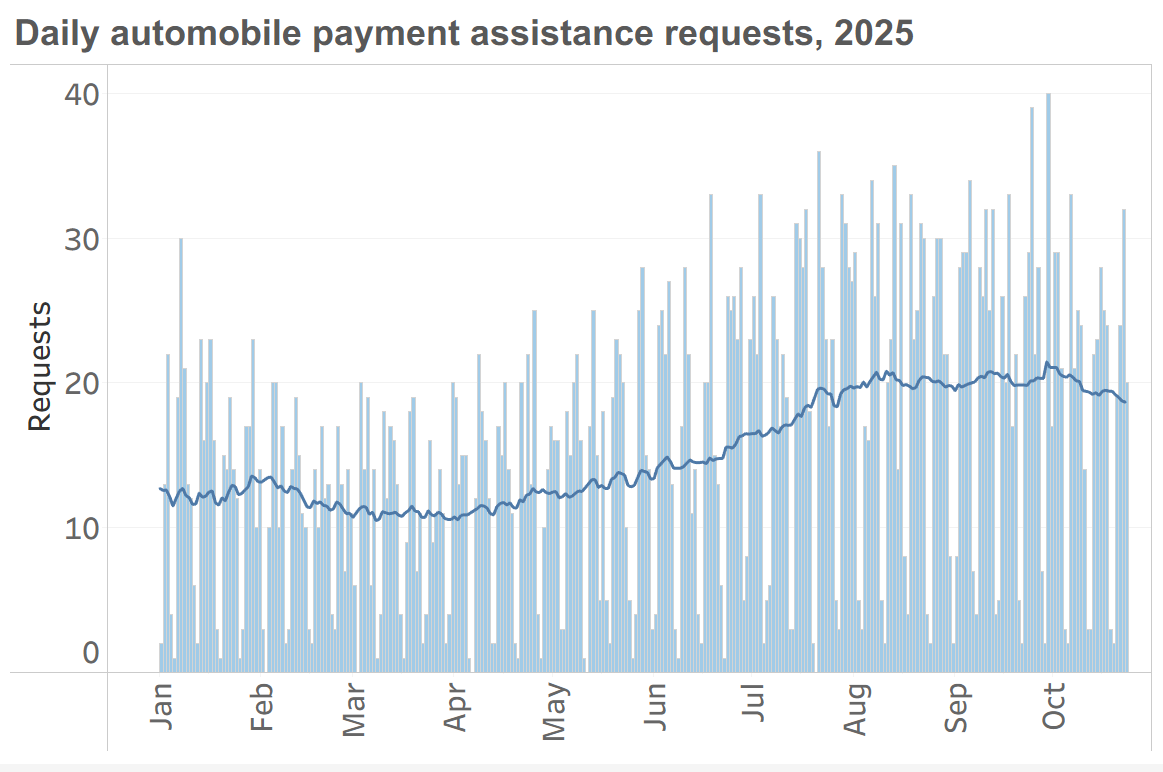 The 211 call data also revealed another worrisome trend: an increasing number of calls for assistance in making car payments. Unlike food aid requests, calls for help with car payments haven’t spiked recently; instead, they have been going up slowly but steadily since the spring and have now reached about double the baseline level of the past two years. This pattern suggests growing economic uncertainty nationwide. People may be looking for financial assistance with car payments so they can free up money for more critical necessities such as food and housing.