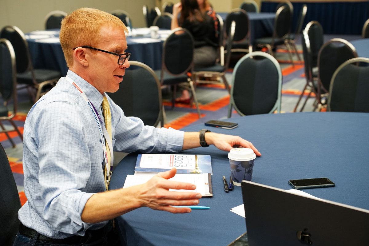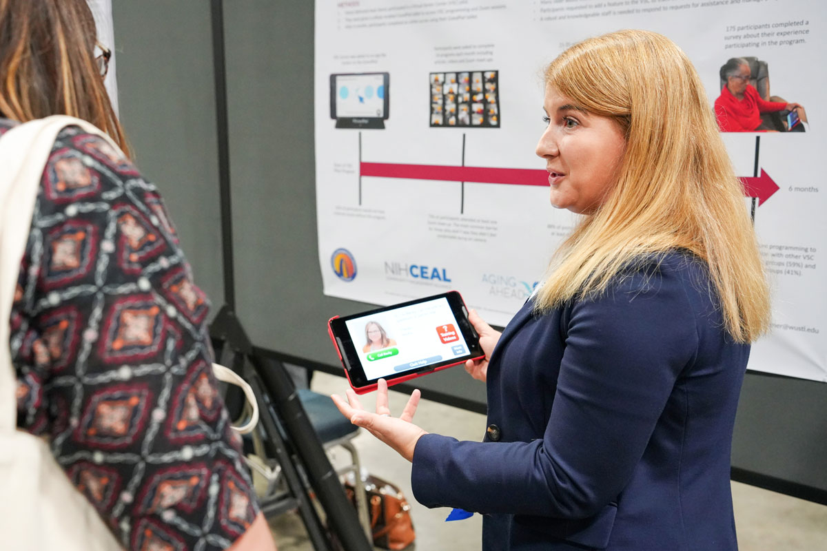 Dean Sandro Galea offers thoughts on navigating differences Monday, November 3, during a panel discussion at the APHA meeting titled, “Breaking the Mold: Bold Leaders Shaping the Future of Public Health.” Shown are (from left) Daniel Dawes, dean of the School of Global Health at Meharry Medical College in Nashville, Tenn.; moderator Celine Gounder, a physician and journalist with CBS News; Galea; and Sarah Story, executive director of Jefferson County (Colorado) Public Health. Also on the panel was Meenakshi Brewster, St. Mary’s County (Maryland) health officer. (PHOTO: E. Holland Durando/WashU Public Health) WashU Public Health Dean Sandro Galea, shown on a large screen at the APHA panel discussion Monday, November 3, makes a point alongside fellow panelist Sarah Story. (PHOTO: E. Holland Durando/WashU Public Health)Karen Skinner, MPH, a doctoral student in public health sciences at WashU Public Health, shows a person visiting her poster session Sunday, November 2, a digital device aimed at helping older adults who live in their homes. Skinner presented two posters at the event: “Assessing the association between social needs and loneliness in older adults who are homebound: A virtual senior center is a promising solution“; and “Virtual social connection: lessons learned from a virtual senior center pilot.” (PHOTO: E. Holland Durando/WashU Public Health)Lena Schulhofer, MHS, a doctoral student in public health sciences at WashU Public Health, explains her research — “Examining the relationship between perceived inclusion, social connection, and refugee health and well-being in the United States: findings from the 2020-2021 annual survey of refugees” — to visitors during an APHA poster session Monday, November 3. (PHOTO: E. Holland Durando/WashU Public Health)WashU Public Health Professor Derek Brown, MA, PhD, presents research — “Understanding preferences for health services for survivors of sexual violence in Uganda: a discrete choice experiment” — Monday, November 3, during a roundtable session at the APHA meeting. (PHOTO: E. Holland Durando/WashU Public Health) WashU Public Health Professor Lindsay Stark (in black) answers questions Monday, November 3, about research she and WashU Public Health Professor Derek Brown (at right) conducted. The group querying the two during the APHA roundtable session were from the University of Alabama. (PHOTO: E. Holland Durando/WashU Public Health)Hannah Kinzer, MPH, a doctoral student in public health sciences at WashU Public Health, offers a visitor to her APHA poster session Monday, November 3, details on how her team conducts research. The project was titled, “Identifying vaccine knowledge and questions in local communities: a mix-methods analysis.” (PHOTO: E. Holland Durando/WashU Public Health)WashU Public Health Dean Sandro Galea makes closing remarks at the release Monday, November 3, of a JAMA Summit Report focused on firearm injury prevention. The report was released during the APHA meeting in Washington, D.C. Galea is one of the report’s co-authors. (PHOTO: E. Holland Durando/WashU Public Health)Olivia Weng, MSPH, a doctoral student in public health sciences at WashU Public Health, describes during an APHA poster session Sunday, November 2, her research project titled, “Public reactions to six ‘core health knowledge’ items – a novel approach to conveying actionable health information.” (PHOTO: E. Holland Durando/WashU Public Health)Ilana Seff, MPH, DrPH, a research associate professor of public health at WashU Public Health, gives a talk during an APHA session Tuesday, November 4, focused on health and immigrants, refugees, and forcibly displaced populations. Her talk was titled, “Reimagining humanitarian aid: integrating self-reliance and mental health support for displaced households.” (PHOTO: E. Holland Durando/WashU Public Health)